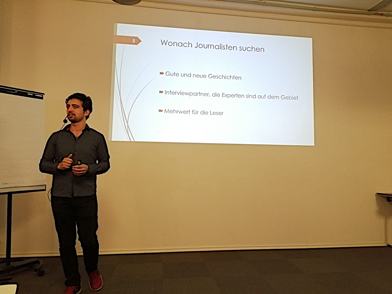 Yakup Özkardes erklärte, wonach Journalisten suchen und was sie gar nicht gebrauchen können. Er gab Beispiele, wie wir Kontakt zu Journalisten aufbauen können, nannte 5 Tipps für eine erfolgreiche Pressemitteilung und gab uns zu guter Letzt noch Hinweise für die ersten Schritte zu einer PR-Strategie.