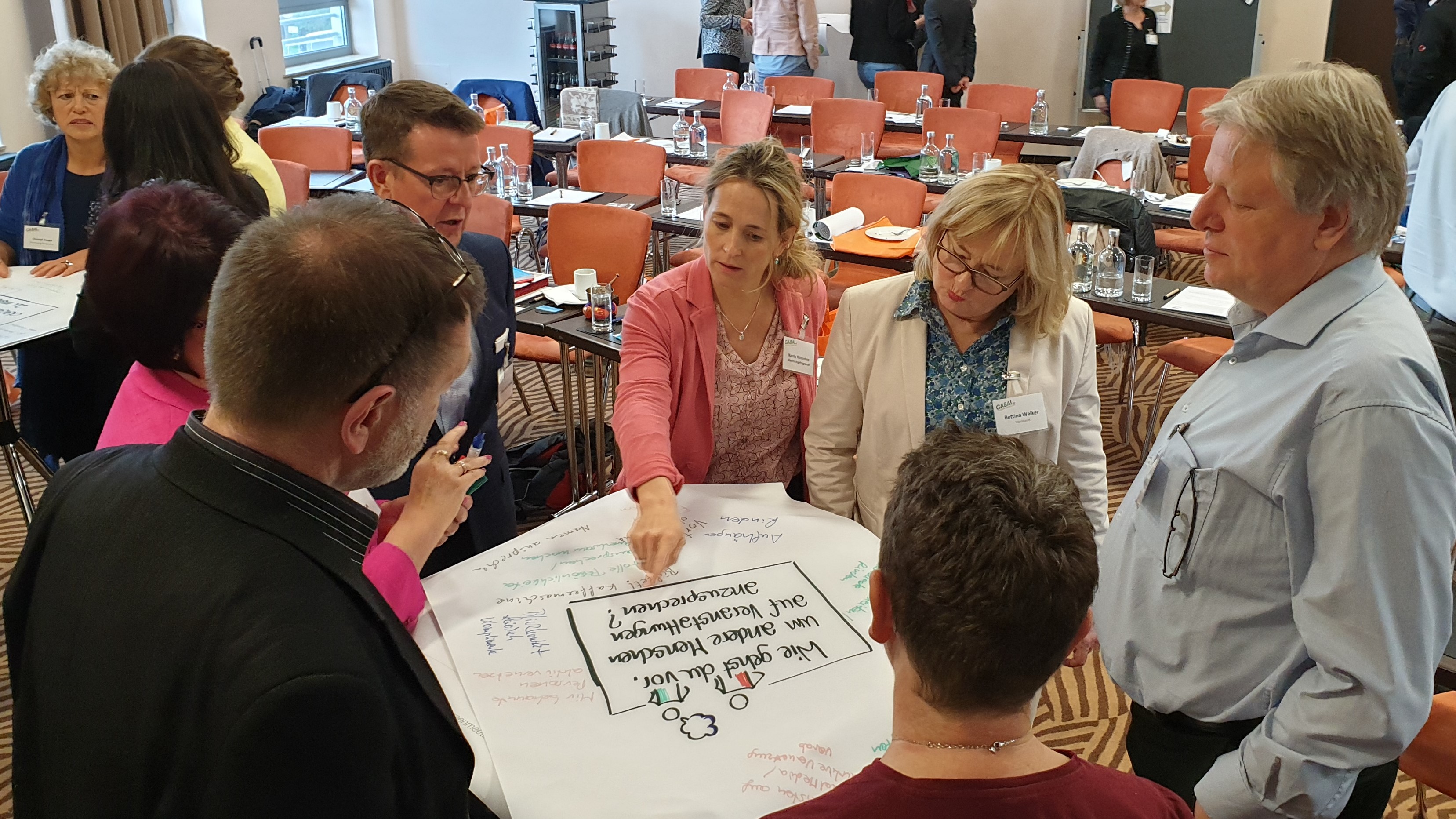 World Café mit 2×3 Tischen zu den bei beiden Runden gleichen drei Fragen: