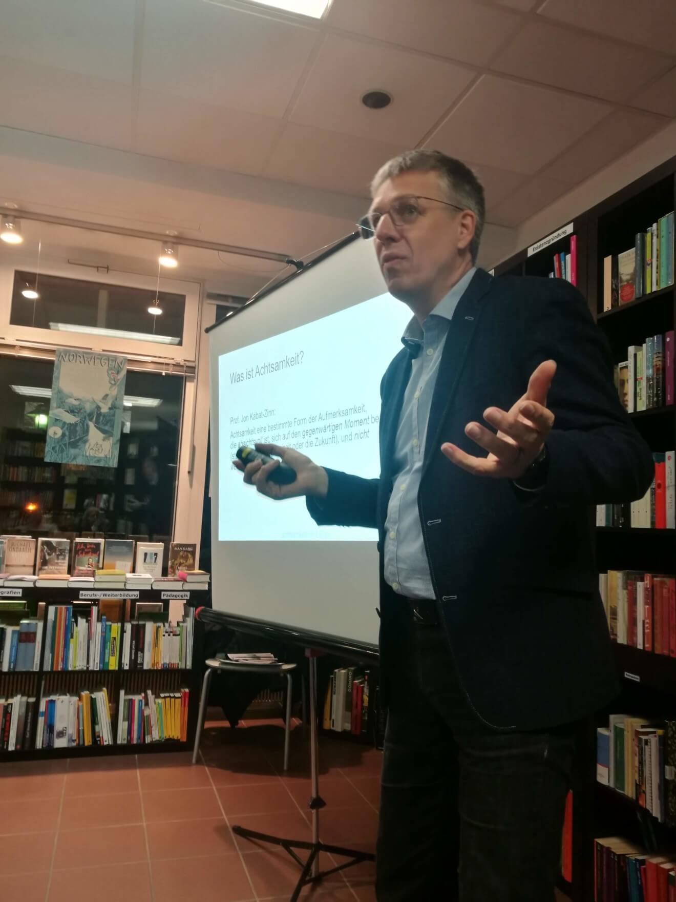Der Referent und Achtsamkeitslehrer Thorsten Friese machte deutlich, dass wir von unseren Erfahrungen über automatische Pfade im Gehirn gelenkt werden. Achtsamkeit ist daher ein Training fürs Gehirn, das diese automatische Steuerung unterbricht – wir können wieder mit offenen Augen durchs Leben gehen und beobachten, was wirklich ist.