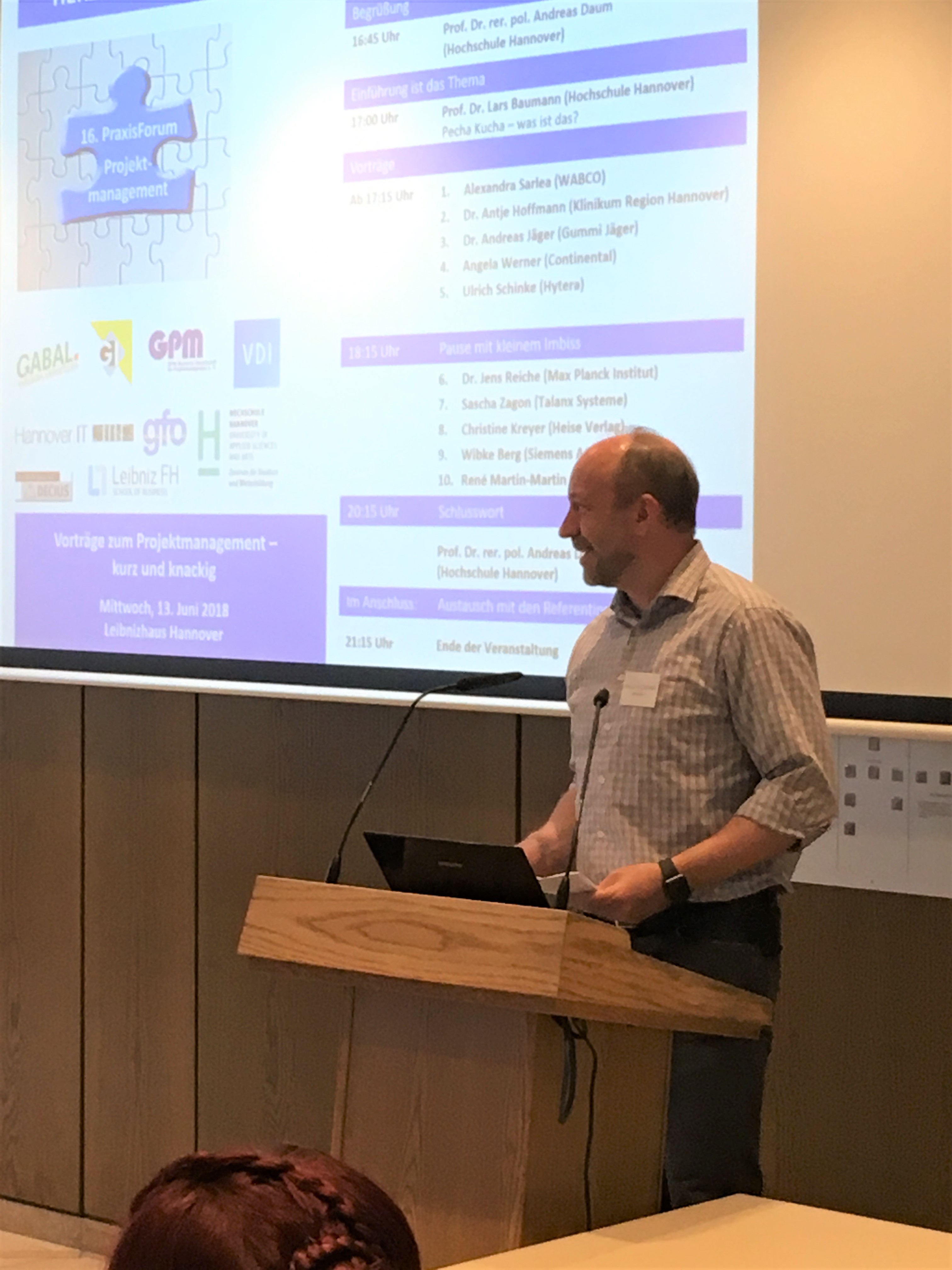 Für die Veranstaltung am 13. Juni hatten wir uns – abweichend vom bisherigen „klassischen“ Vortrag mit vier Referenten – für ein neues Format entschieden: Zwölf Vorträge zum Thema „Projektmanagement“ nach der Pecha-Kucha-Methode.