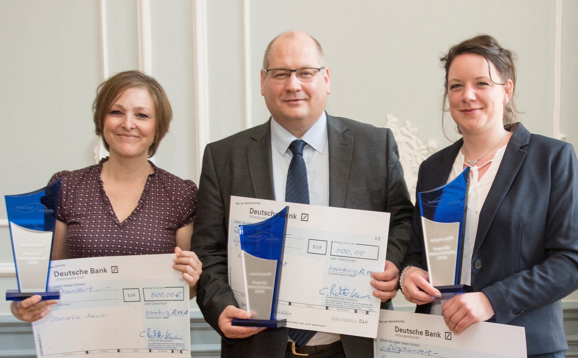 „In diesem Jahr entschieden sich die Juroren der Hamburger Akademie für zwei Absolventinnen und einen Absolventen, die eine beachtenswerte Lernhistorie hinter sich haben und dank der erworbenen Qualifikation neue berufliche Ziele erreicht haben“, so Elmar Thiel, Leiter der Hamburger Akademie. Für den Preis bewerben konnte sich, wer im zurückliegenden Jahr einen der über 200 Lehrgänge der Hamburger Akademie erfolgreich abgeschlossen hat. In einem feierlichen Festakt gingen die diesjährigen Preise an Daniela Sauer, Job-Coach aus Hürth, die Heilpraktikerin Yasmin Humbracht aus Lauenau und den Projektmanager Andreas Kietz aus Neubrandenburg. HAF_smartLearn-Preis für Weiterbildung